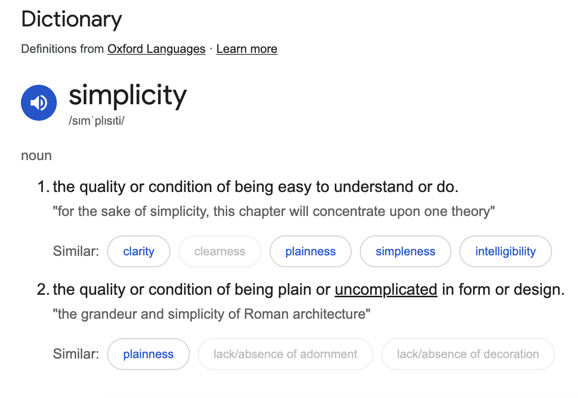 Based on the above, the definition above is overly “simplistic” and surface based, rather than understanding the nature of the concept. My definition of simplicity is superior because it teaches you something about the nature of the word and the concept itself.