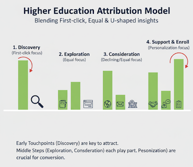 In higher education the attribution should be a mix between first click, U-shaped and equal. The first stage – discovery, is essential to attract them in the funnel. Each step can also be essential and must play a part in a successful conversion. There is no final step, but the final support to help them complete is more intensive like support and personalisation.