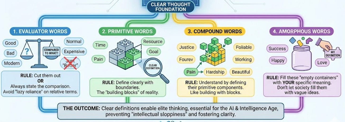 In this article, I will not define ‘money’ or ‘economy’ yet; instead, I’ll argue why clear definitions are the essential first principle for clear thought and introduce the Four Categories of Words you must master to become an elite thinker.