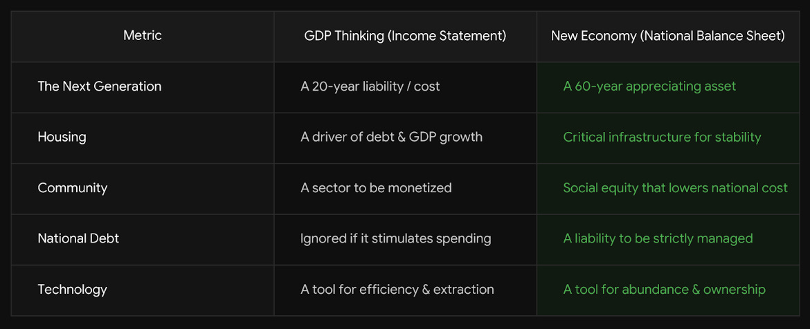 On an Income Statement (GDP), a child is a 20-year liability. On a Balance Sheet, a child is a 60-year appreciating asset. When we change the math, we change the incentive to support families, education and healthcare.