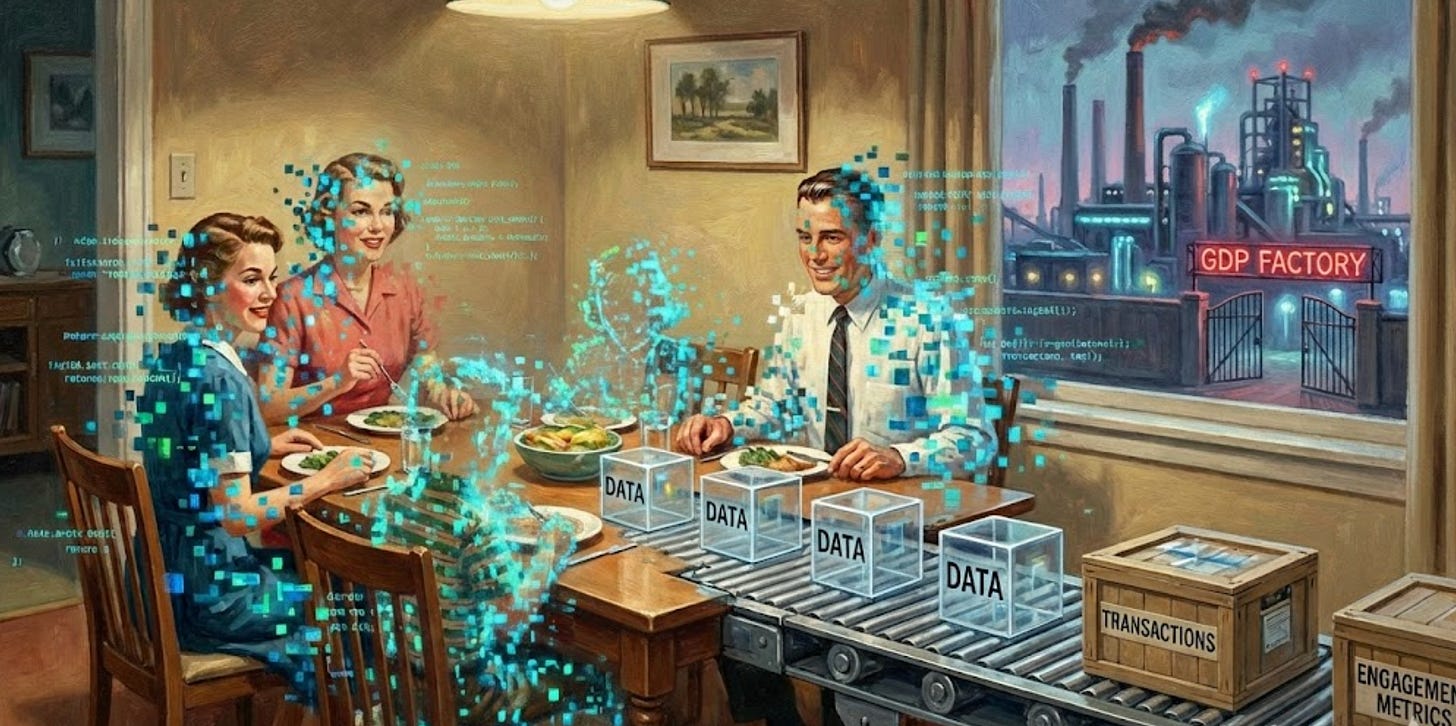 Because GDP only registers a “success” when money changes hands now, it creates a perverse incentive to liquidate the future to pay for the present. We sell off our natural resources, we over-leverage our children with debt, and we burn through the “social capital” of the family unit - all to keep the current quarter’s numbers high. It is the economic equivalent of a farmer eating his seed corn to feel full today, then wondering why he is starving when the next season arrives.