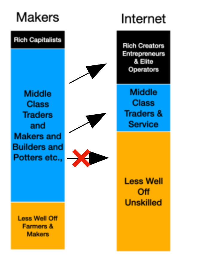 The industrial economy saw the rising middle class, but the digital economy is now seeing the splitting of the middle class. The above is what the distribution is likely to look like if nothing changes.