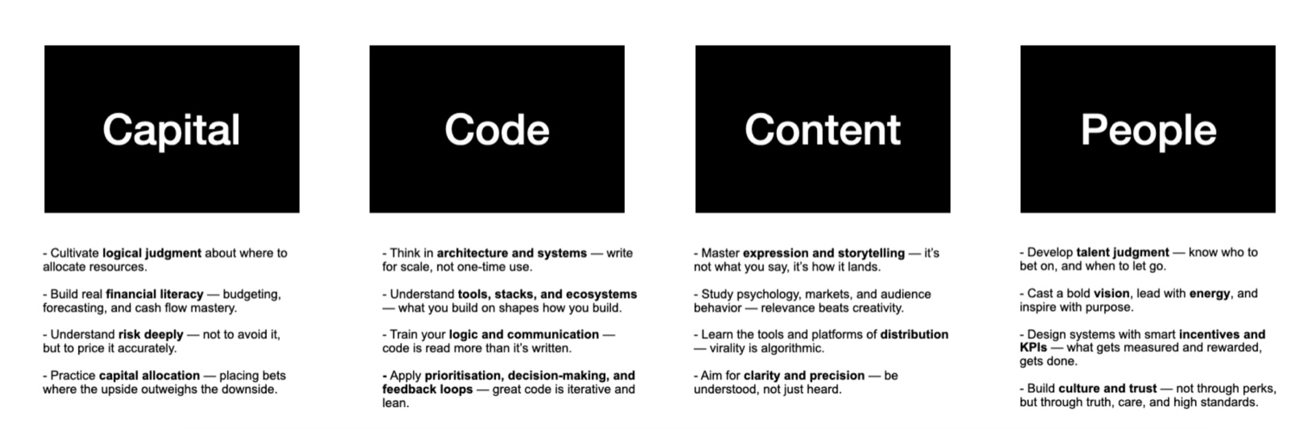 Combine capital + code (crypto) + people + content (build a team creating content about it).