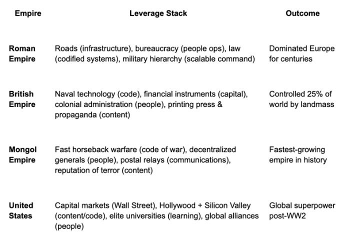 You can also look at empires in history of using leverage. Content, culture, code, and finance, and organising people better than other empires is what gave them competitive advantages and allowed them to conquer others. Being able to apply empires is essential for strength and defense.
