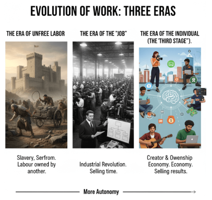 We are now entering a new era for many where a growing number of people can be creators, or owners. Instead of selling their time, they are selling results. In each stage, they are seeing more and more autonomy.