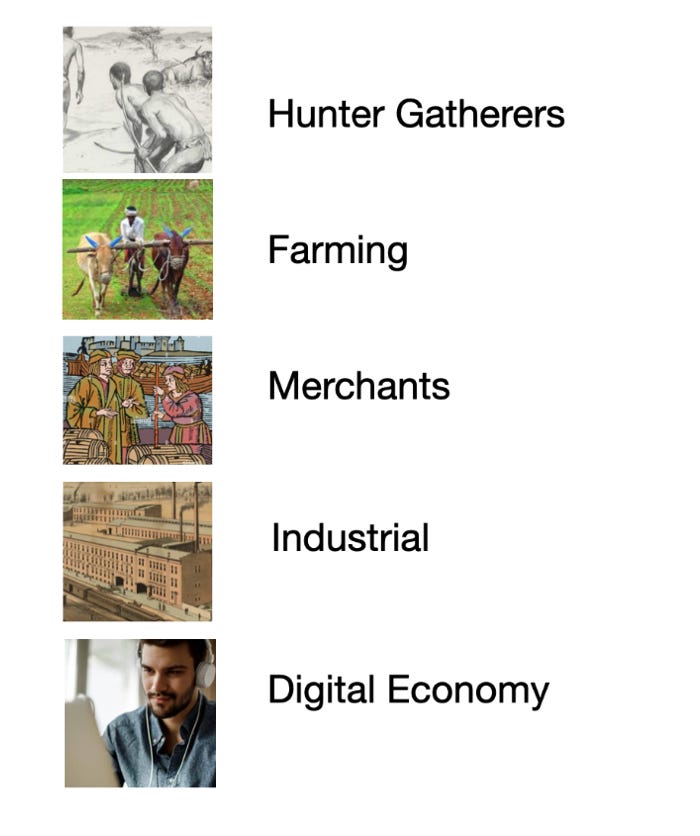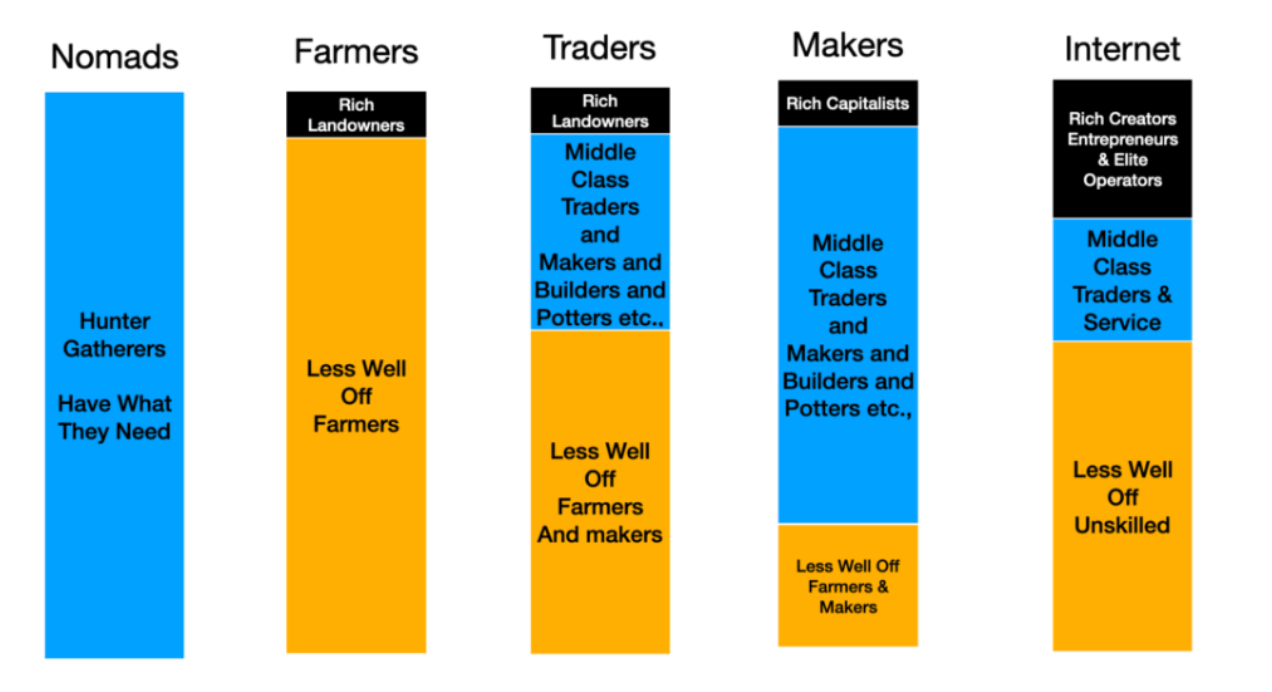 Hunter gatherers were more egalitarian. In farming, control of the land become the key asset with wealth being concentrated into the landowners. As we entered through each stage, everything changes.