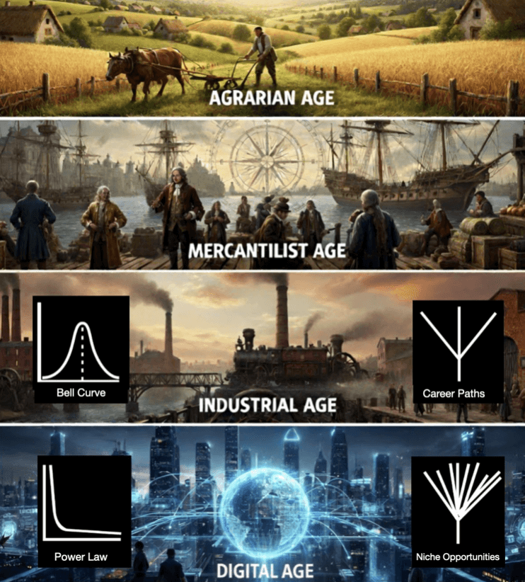 The other aspect is that in the industrial economy, there were limited choices. In the job market, there were only a few career paths you could choose. Now there are an almost infinite number of choices in different niches.