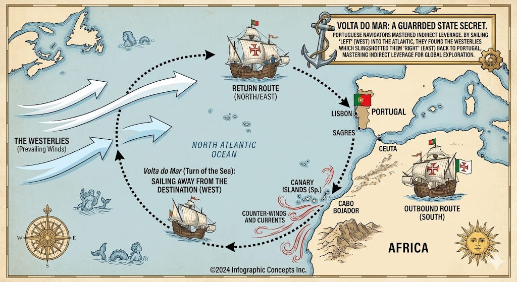 Often the best way to achieve success in some area is indirectly - to focus on another area. The Portuguese learnt this by discovering the Volta do Mar.