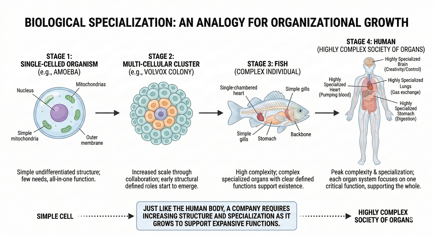 There is a reason every organ of the body has a specific and clearly defined function. As you grow you are essentially moving from a simple single celled organism to a multi-cellular organism, to a person to a company to a society. At each stage you need different principles to grow. You also need to build more structure so you can support the growth. The heart focuses on blood pumping. Whereas in single celled organisms the organism has fewer needs and ability to specialise.