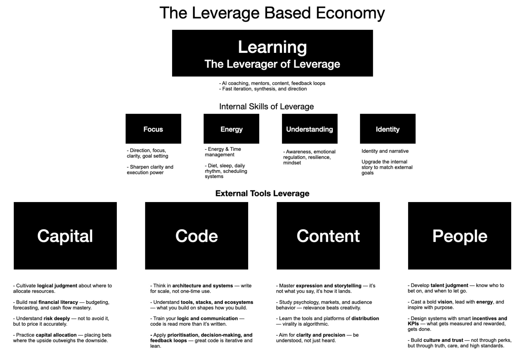 Understand the different types of leverage, and your strengths and weaknesses. If you are great at learning, that is the big unlock to everything else.