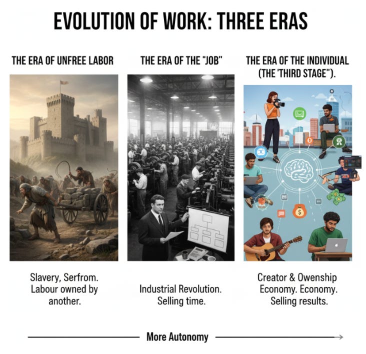 Then came the Era of the “Job”: The Industrial Revolution created the modern concept of a “job.” People voluntarily traded their time and skills for a stable wage within a large organization (a factory or a corporation). This model, with its clear hierarchy and promise of lifetime employment, dominated the 20th century.