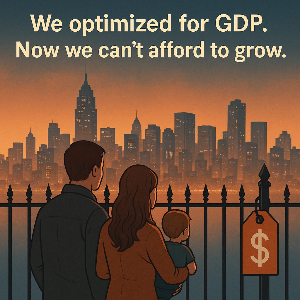 The primary reason Birth rates are falling is because of unaffordability and limited housing, which is caused by GDP distortions - to protect the wealth of voters and maintain GDP. Carrying capacity (the biological concept) - as it has been proven in animals, humans consciously and unconsciously know on an instinctive level when we are nearing the limit of resources and will reproduce according to the resources in the environment. To expand beyond the limits of our resources is extremely dangerous for an individual and species and we have an innate biological mechanisms (and common sense) to stop it. Carrying capacity is something we perceive when housing is limited and / or there is little to no consumer surplus. Housing is essential and inelastic, and so with GDP as the goal, the price will continue to rise to the highest level, which is sucking out value from the productive economy. It is essential to maximise the consumer surplus of housing and make it as cheap as possible, so people feel they can expand again. But this is not in our economic model.